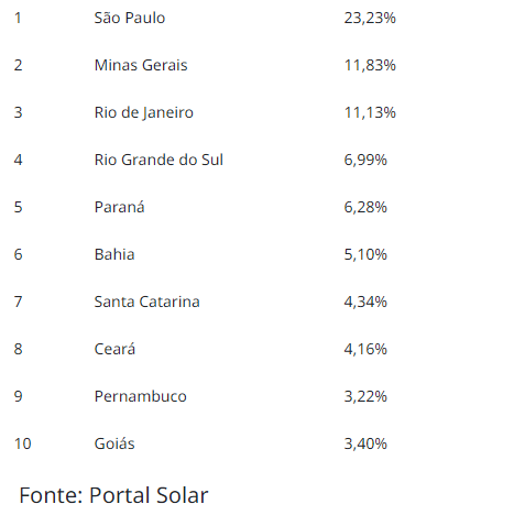 No ranking dos estados, os consumidores de São Paulo, Rio de Janeiro e Minas Gerais lideram o nível de interesse por geradores solares. Do total de procura no Portal Solar, os paulistas representam 23,23%, seguido pelos mineiros, com 11,83%, e fluminenses, com 11,13% (veja ranking abaixo).